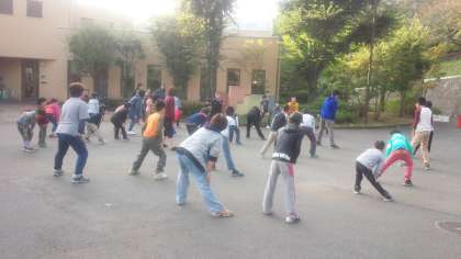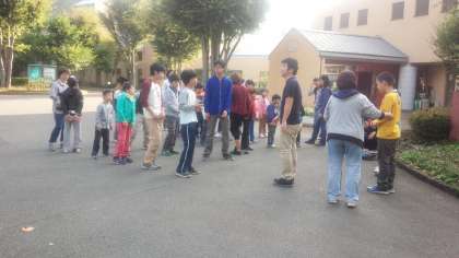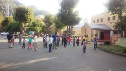 おはようございます。7時、朝の会です。よく眠れた子、あまり眠れなかった子もいましたが、朝の新鮮な空気をしっかり吸いました。半袖では、少し肌寒かったです。青空、よいお天気です。