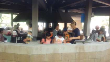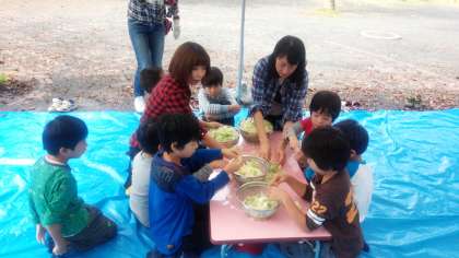 10時30分、火おこし、野外調理の始まりです。高学年は、火おこし、中学年は、野菜切り、低学年は、野菜洗い。みんな、一生懸命取り組みました。