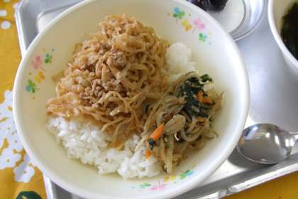 給食では栄養面を考えて、豚挽き肉と切干大根を一緒に
