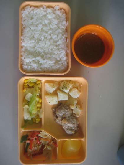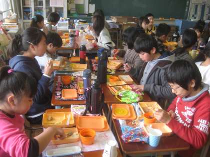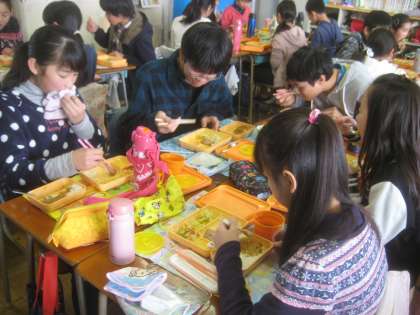 普段の食缶に入っている給食とは違い、お弁当箱に入っていて、子供たちはとても興味津々でした。