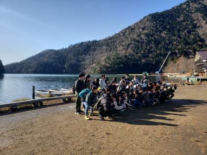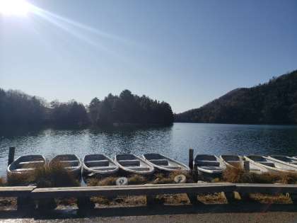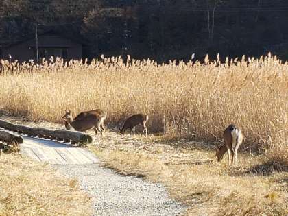 湯ノ湖をバックに記念写真。近くに鹿がのんびりと。