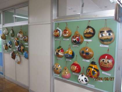 4階廊下(東側)に日光で作った「ふくべ細工」の作品と1学期末の図工の時間に作成した、「焼き物」が展示されています。明日の学校公開日には、是非作品をご覧ください。お待ちしています。