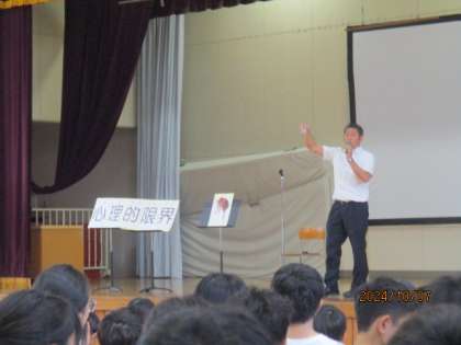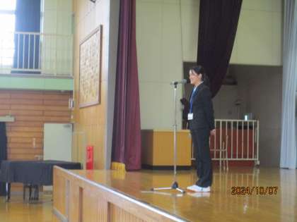 今日の全校朝会は、盛りだくさんでした。まず校長講話から始まりました。学校だよりで紹介した「ノミの実験」について話しました。「心理的限界」を作らないように、「できない」と決め付けず、何でも挑戦する大切さを話ました。