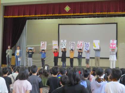 最後に、児童会・代表委員会から運動会のスローガンの発表がありました。みんなでスローガンを読み、運動会に向けて気合が入りました。