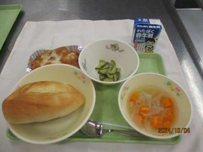 給食室ではルーから手作りし、カップに入れて上からチーズをのせてオーブンでこんがり焼き上げました。