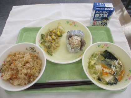 10月10日は目の愛護デーです。今日は、にんじんや卵など、目によい栄養がある食べ物を使った献立を提供しました。