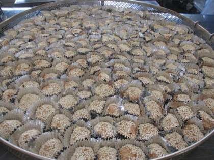 ミニいが蒸しは、手で丸めた肉団子にもち米をまぶして蒸し上げました。見た目が栗のイガ(栗の皮の部分)にも見えることから、いが蒸しと呼ばれています。