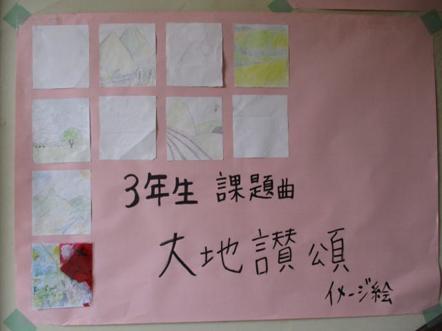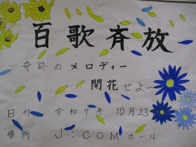 合唱コンクール本番がいよいよ今週の木曜日に迫ってきました。先週のリハーサルを経て各クラスとも練習が佳境に入ってきました。今年のテーマは「百花斉放~奇跡のメロディ開花せよ~」です。久しぶりの J:COMホールに各学年・各クラスの奇跡のハーモニーを響かせよう。3年生は課題曲「大地讃頌」のイメージを絵にしました。