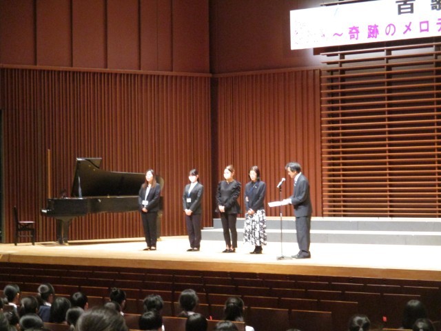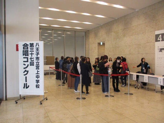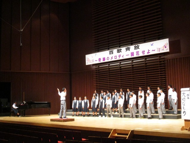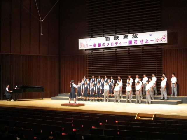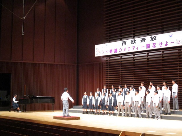 合唱コンクール本番1年生です。初めての舞台で元気よく歌いました。最優秀賞は1年4組、他クラスも頑張りました。また、多くの保護者の方にご来場いただきました。