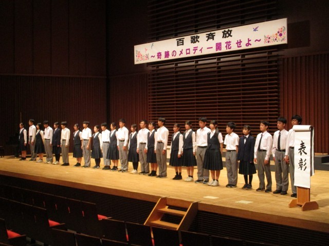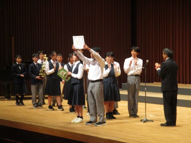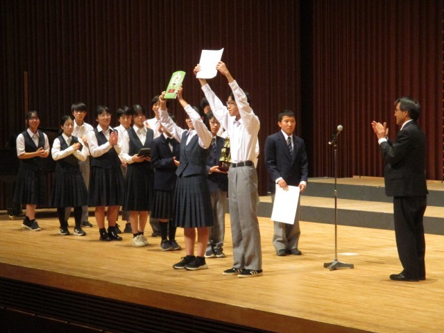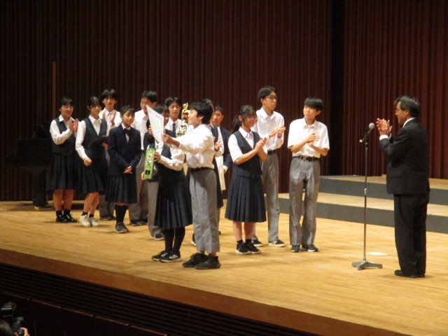 審査員の先生の講評の後、表彰式が行われ、代表生徒は誰も誇らしげに校長先生から賞状と盾をいただいていました。その後の閉会式では実行委員に対して全校生徒からねぎらいと感謝の拍手が贈られ、実行委員長の言葉で合唱コンクールが締めくくられました。