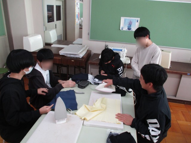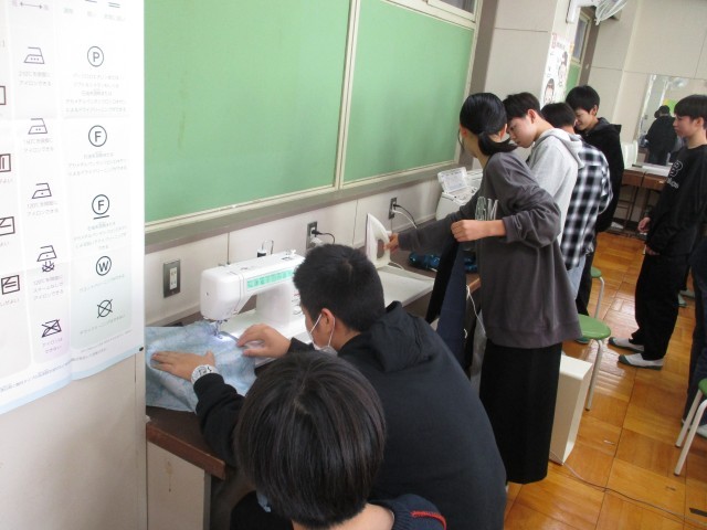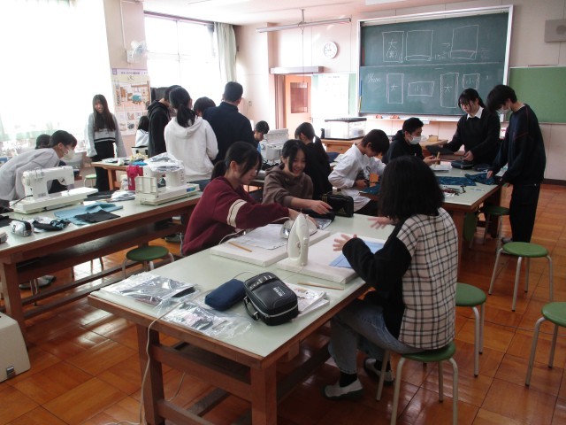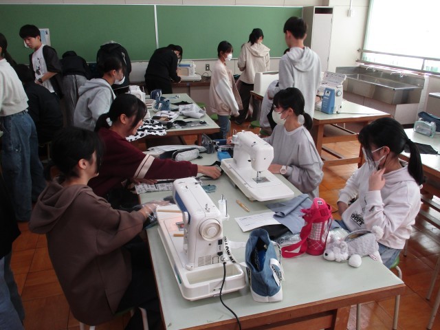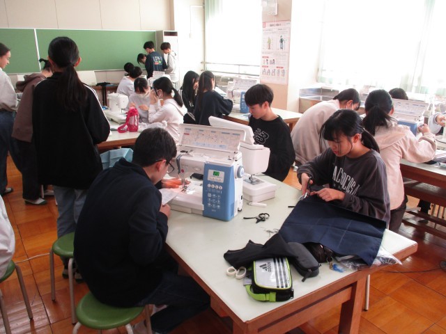2年生の家庭科の時間は被服実習で、「トートバッグ」作りです。日頃使うことのないミシンやアイロンを使って自分で用意したお気に入りの生地を仕上げていきます。
