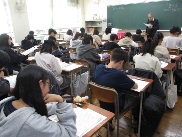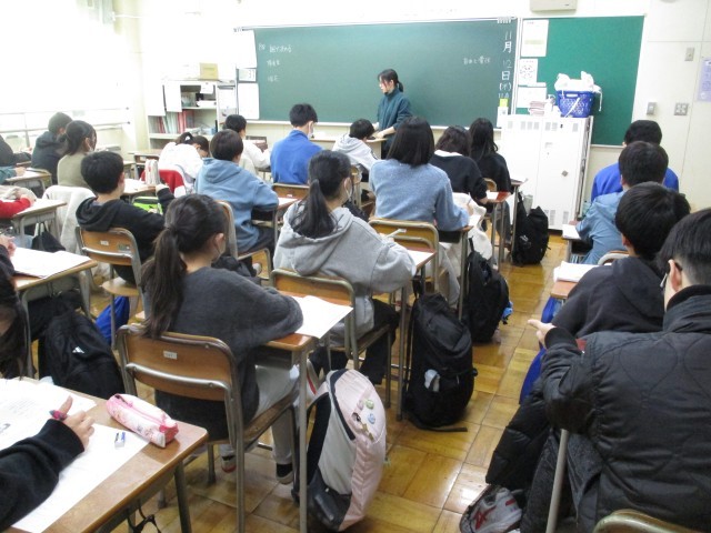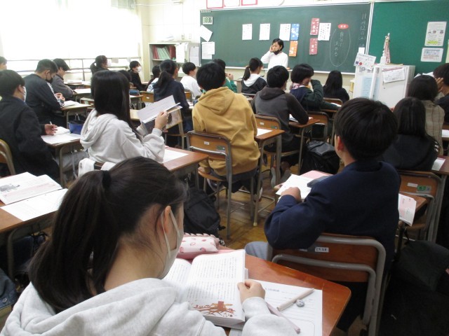 1年生の道徳授業は教科書の「部活動の継続とスマホ」の話題を用いて、自分で決める時に何が大切かを話し合った。