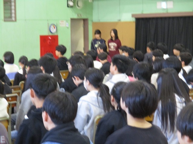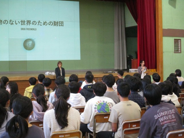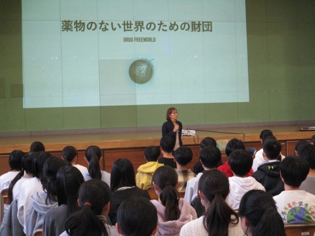 今日の5時間目は2年生が体育館で「薬物乱用防止教室」を行いました。ヘアーメイクアーティストの方がボランティア活動の一貫でご自分の経験も踏まえながらわかりやすく説明してくださいました。自分たちとは関わりのない話だと思っていた生徒たちも実は身近なところに危険が潜んでいることを再認識したようです。