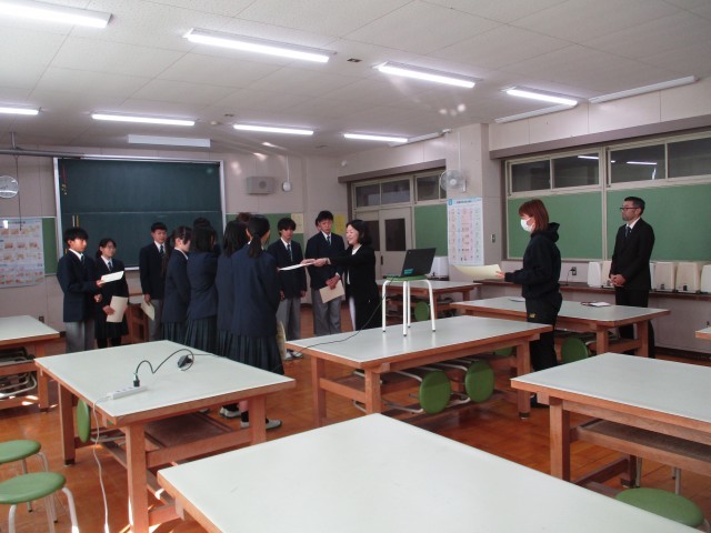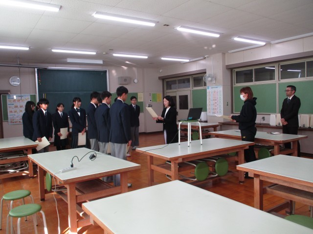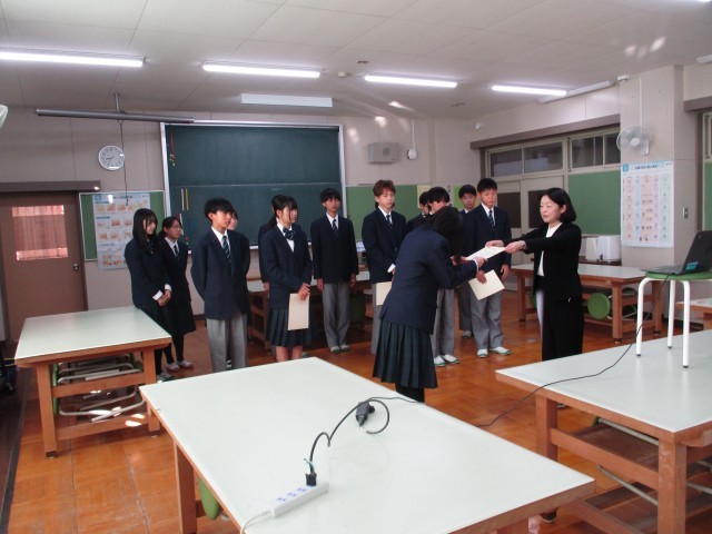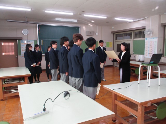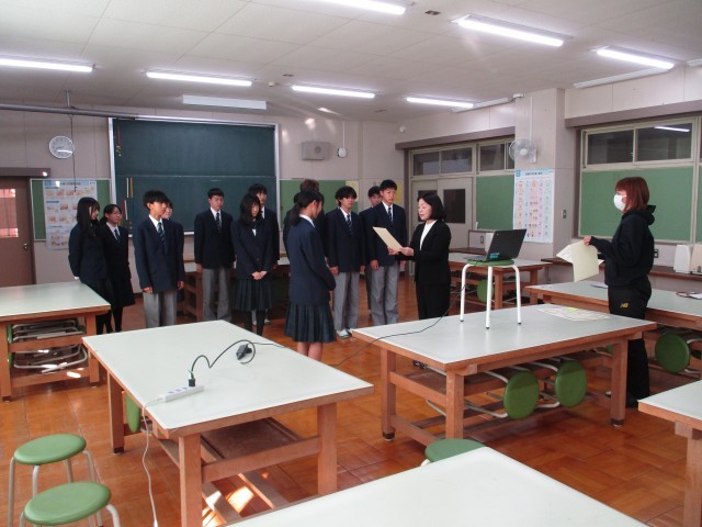 今日の朝礼は被服室よりリモートで行いました。最初に副校長先生よりインフルエンザ対策のお話があり、次に図書委員長からの連絡、そして陸上部の大会各種目の入賞者の表彰と続きました。全校生徒は各教室で話を聞き、陸上部の活躍をお祝いしました。
