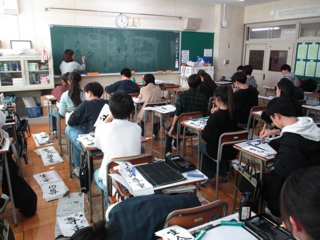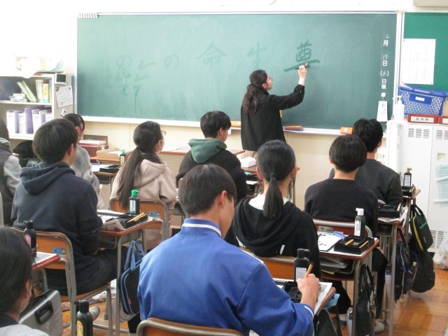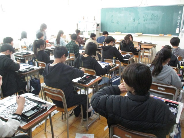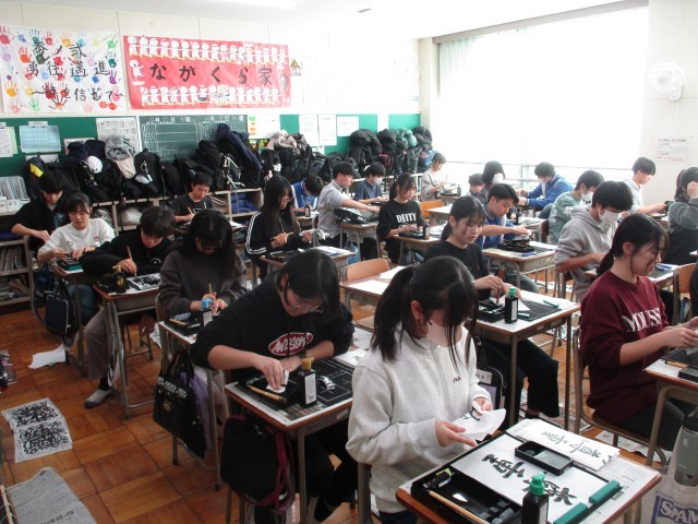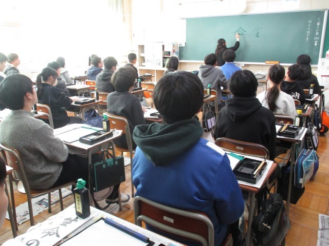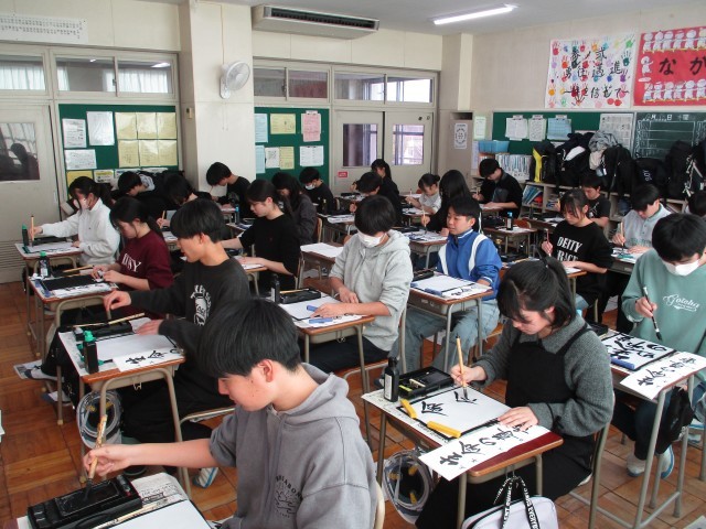 年末年始恒例の「書き初め」週間、今年の3年生のお手本は行書の「生命の尊重」か楷書の「雄大な自然」です。筆を取ると集中して取り組んでいました。