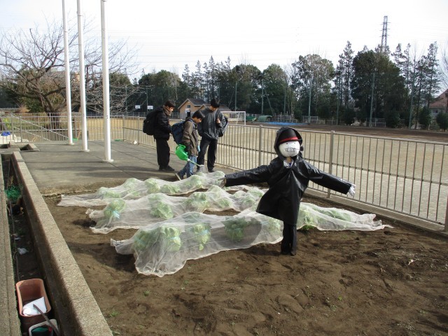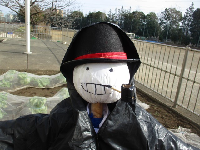 今日は作業の時間に生徒と先生が協力して作った「案山子」を畑に立てました。大根の収穫は終わりましたが、白菜の成長を「案山子」くんが見守ってくれています。