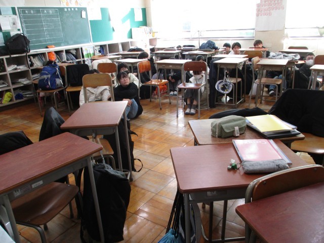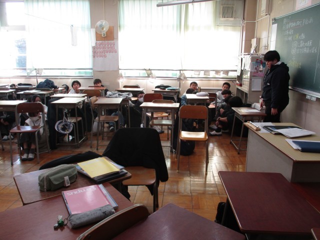 今日の訓練は不審者対応訓練です。ベテランの先生が迫真の演技で不審者役を務めました。生徒たちは先生の指示で教室の入り口をバリケードで固め、静かに身を潜めて、不審者が去るのを待ちます。不審者が去った後に安全確認をして、最後に副校長先生の講話を聞きました。