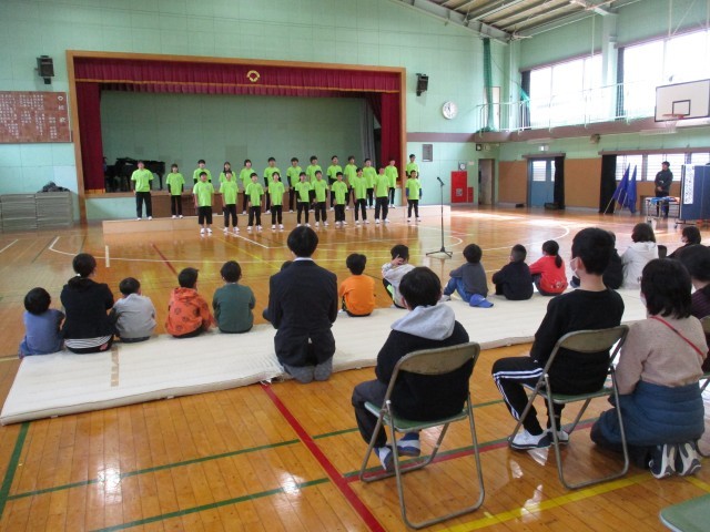 今日は宮上小学校の「こすもす学級」をお迎えして、交流会を開催しました。事前準備のフラッグもばっちりです。2年生司会者が進行を務め、歓迎の挨拶から始まり、校長先生のお話、そして合唱を披露します。
