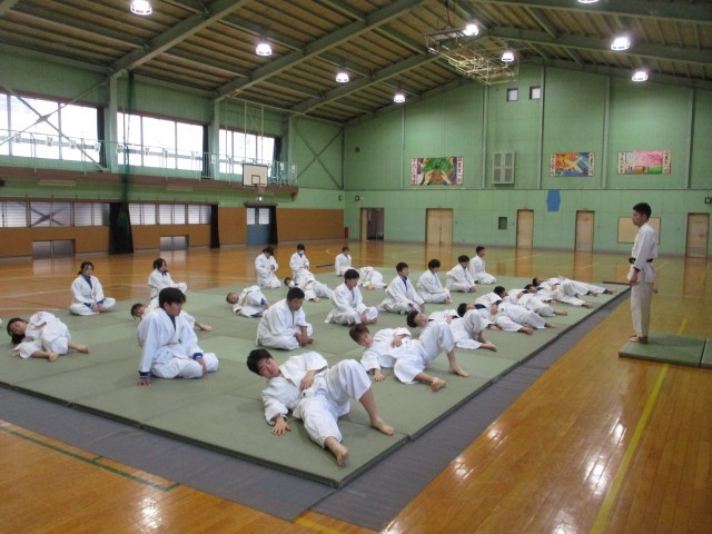1年生の体育は体育館で柔道でした。礼に始まり礼に終わるの言葉通り、姿勢を正し、挨拶をしてから始めます。。最初は怪我防止のために準備運動をし、念入りに受け身の練習です。そして本日のメインは立ち技「足払い」の練習でした。