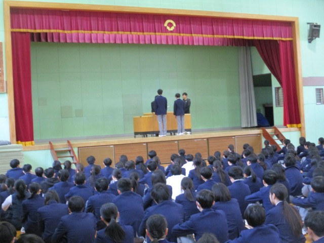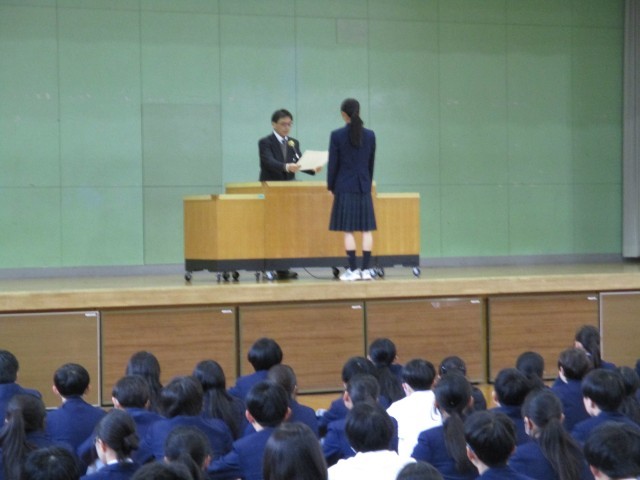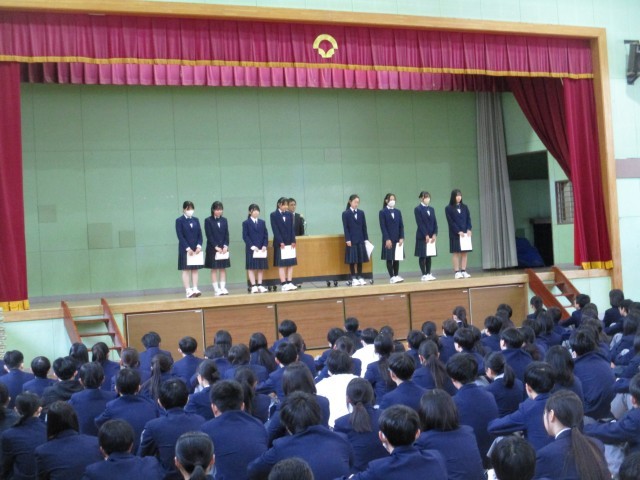 今日は久しぶりに体育館での「朝礼」です。校長先生からは「頼る・頼られる」というお話でした。その後は野球部・書き初め展・テニス部で活躍した生徒たちの表彰を行いました。