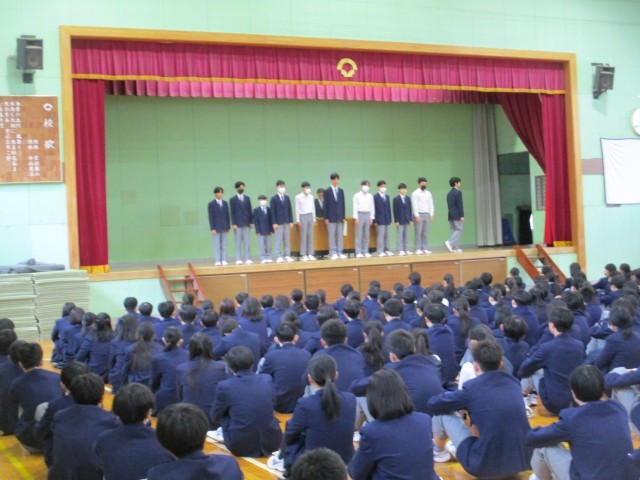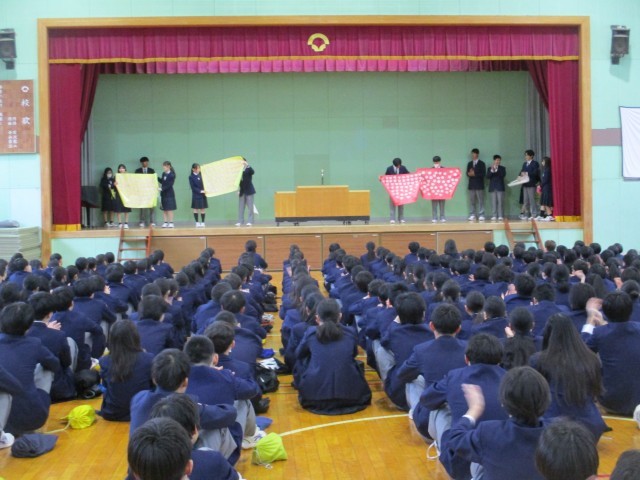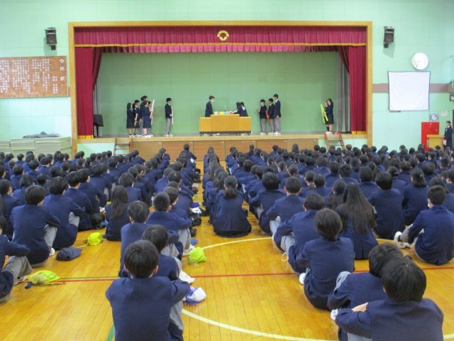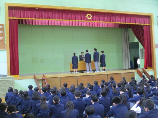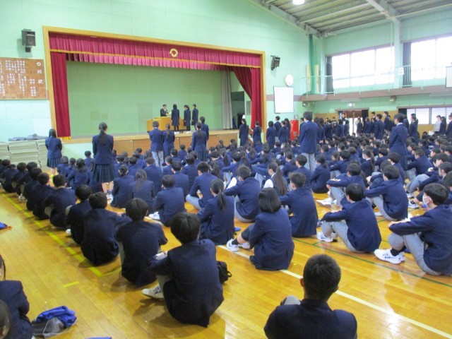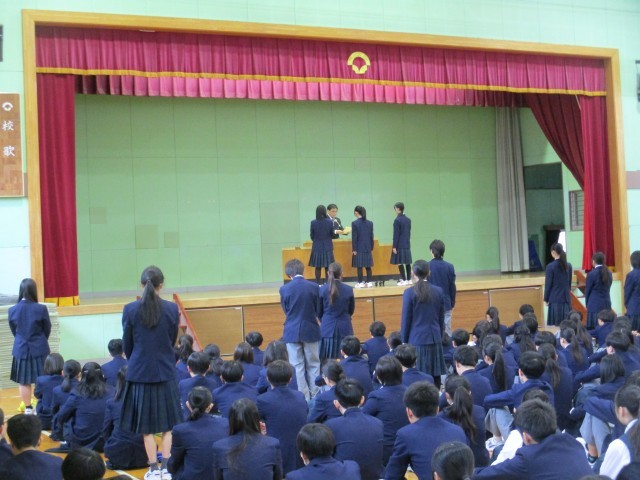 今朝は「生徒朝礼」がありました。3年生は卒業式まであと3日です。在校生から卒業生へ、卒業生から在校生へとそれぞれメッセージカードが手渡されました。その後は表彰です。全校生徒で男子バスケットボール部、美術展、家庭科展で活躍した生徒たちのお祝いをしました。