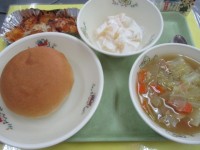 ☆今日の献立☆・国産小麦パン・ポテトのミート焼き・ABCスープ・りんごのヨーグルトあえ・牛乳