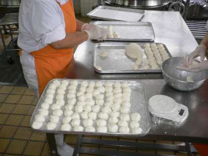 給食室では、大きなお団子をつくり、きなこと黒蜜をかけていただきました。