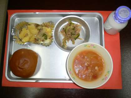 今日の給食のミネストローネは、白インゲン豆、マカロニ、キャベツ、人参、玉ねぎ、鶏肉をいれ煮込みました。