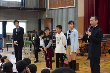 生まれて初めて見る楽器や、聞き覚えのある楽曲まで、幅広く演奏して下さり、児童の代表が指揮者体験もすることができました。