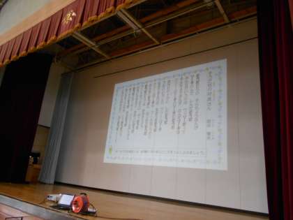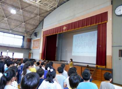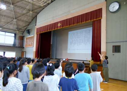 各クラスから選ばれた「そうだ合唱団」の人たちが中央に並び、「そうだ」「ソーダ」の部分を強調しました。だんだんに息が合い、迫力のある群読になりました。
