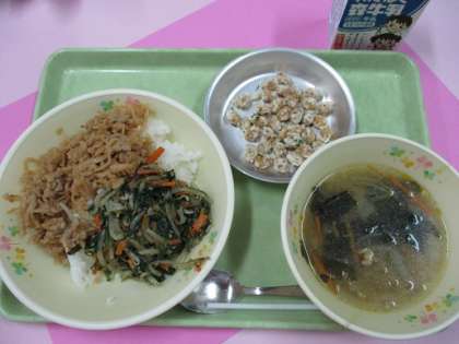 4月16日(金) 今日の給食 公開日 2021/04/16 更新日 2021/04/16 給食室より 4月16日(金)<今日の献立> ・ビビンバ ・新玉ねぎのスープ ・ポップビーンズ ・牛乳 *ビビンバは、お隣「韓国」の料理です。ビビンが混ぜる、バがご飯という意味です。 たっぷりの切り干し大根を肉に混ぜて作りました。 いいね(0)