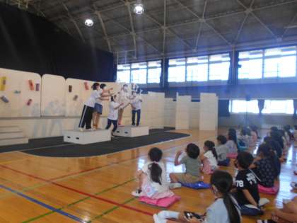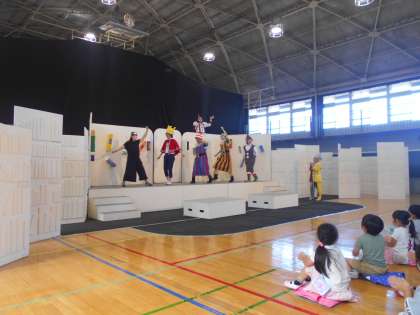 演劇鑑賞教室で、劇団風の子さんの「ちぇんじ 図書室のすきまから」を鑑賞しました。いつもの体育館が素敵なステージに大変身。密を避けるため、1〜3年と4〜6年の2回公演にしていただきました。間隔をあけて座席を配置したり、演者の方々はフェイスシールドをした上で十分に距離をとったりと、感染症対策もしっかり取っていただきました。