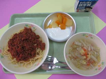 3月16日〈水)今日の給食 公開日 2022/03/16 更新日 2022/03/16 給食室より 3月16日(水)<今日の献立> ・スパゲッティミートソース ・白菜スープ ・フルーツヨーグルト ・牛乳 *卒業式の練習も大詰めになってきました。大人気のスパゲッティミートソースのおいしそうな匂いが、廊下などにも朝から漂っていました。 いいね(0)