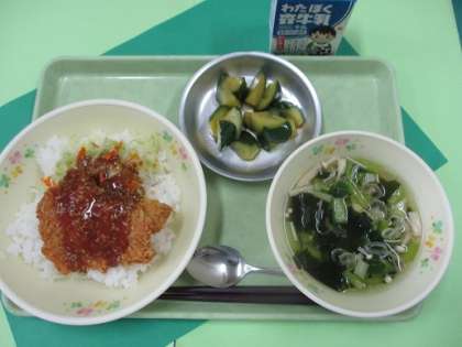 5月13日(金) 今日の給食 公開日 2022/05/13 更新日 2022/05/13 給食室より 5月13日(金)<今日の献立> ・みそチキンカツ丼 ボイルキャベツ添え ・スタミナきゅうり ・青菜と豆腐のすまし汁 ・牛乳 いいね(0)