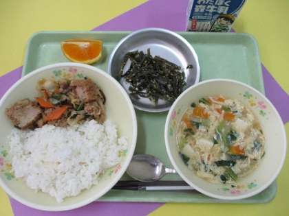 9月5日(月) 今日の給食 公開日 2022/09/05 更新日 2022/09/05 給食室より 9月5日(月)<今日の献立> ・ごはん ・生揚げのみそ炒め ・茎わかめのごま風味 ・かきたま汁 ・バレンシアオレンジ ・牛乳 いいね(0)