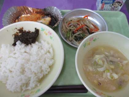 ☆今日の献立☆ 学校給食週間 育む ・ごはん のりの佃煮 ・夕焼小焼やき ・ごま和え ・呉汁 ・牛乳