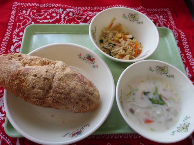 ❖今日の給食❖*ミルクパン*ポークビーンズ*ツナサラダ*りんごジャム*牛乳 今日...