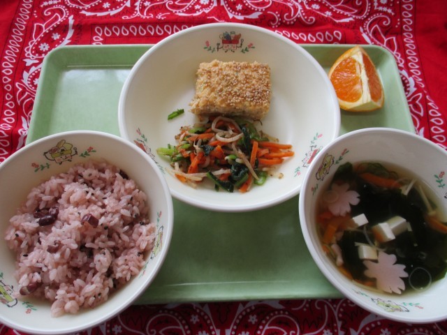 ❖今日の給食❖*赤飯*和風ハンバーグ*野菜とじゃこのおひたし*お祝いすまし汁*果...