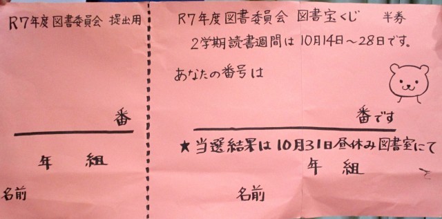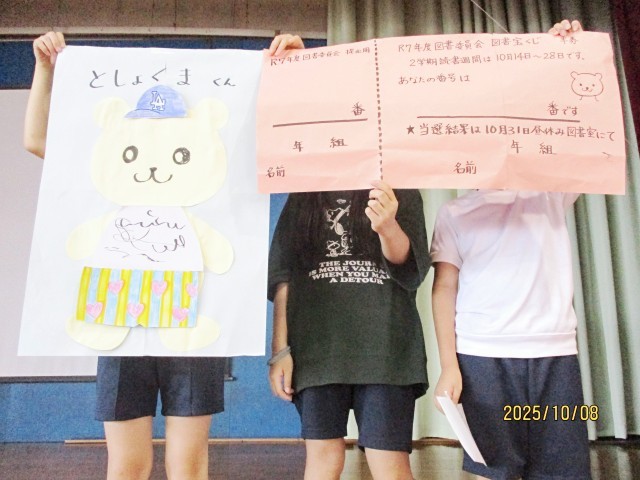 今朝の児童集会では、学校の教育活動の取組である「秋の読書週間10月14日から10月20日」に合わせて、5・6年生の図書委員会の発表がありました。年間を通して、図書館や市の公共図書館を活用しての読書指導として、本に親しむことや読書感想文、読書活動を進めています。特に、今年度は、図書委員会の児童の発案で、学校図書館を活用して読んだ本の冊数によって、「図書宝くじ」や各学級ごとの「クラス対抗150冊走」等の取組を行います。委員会児童の考えた「図書室キャラクターのくまちゃん」を学級対抗でカスタマイズしていきます。最終目標は、3学期末までに学校全体で、「5550冊」の読書です。これは、昨年度の「図書室にこいこい」から貸し出し読書冊数を「5151冊」にして、目標を達成したことで、さらなる高みの目標と委員会児童が主体的に考えたものです。とても、頼もしく、うれしい委員会活動だと思います。