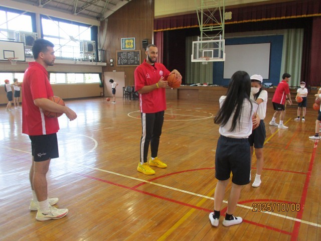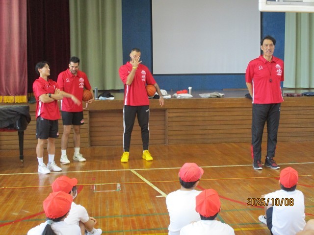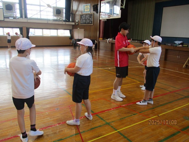 今年度も、八王子を拠点とするプロバスケットボールチームの八王子ビートレインズのコーチと選手の皆さんが、楽しいボール運動とミニバスケットボールの出前授業を行ってくださいました。対象児童は、6年1組と5年1組、なのはな学級の5・6年生です。今は、バスケットボール協会や八王子ビートレインズのコーチをされている日本人初のプロバスケット選手で2m10cmの方をはじめ、現役選手・コーチの方々と楽しく運動することができました。コーチからのお話の約束事で、「無理といわない。あきらめず取り組んでみる。そして、楽しむ。」を子どもたちは、一生懸命に楽しく取り組む姿が見られました。