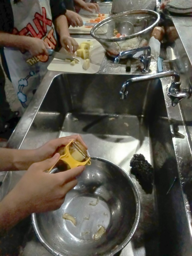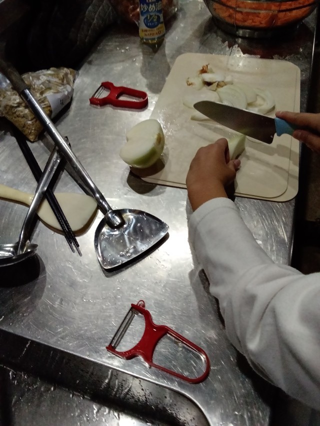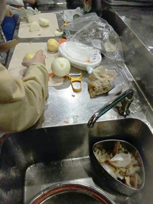 野菜切りに苦労しています。先生方も、手取り足取り、声を掛けながらも、子どもたちが出来ること、挑戦することに細心の注意を払いながらのカレー作りです。