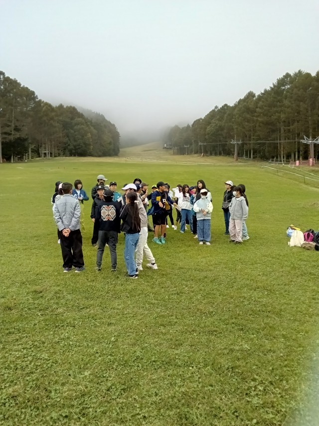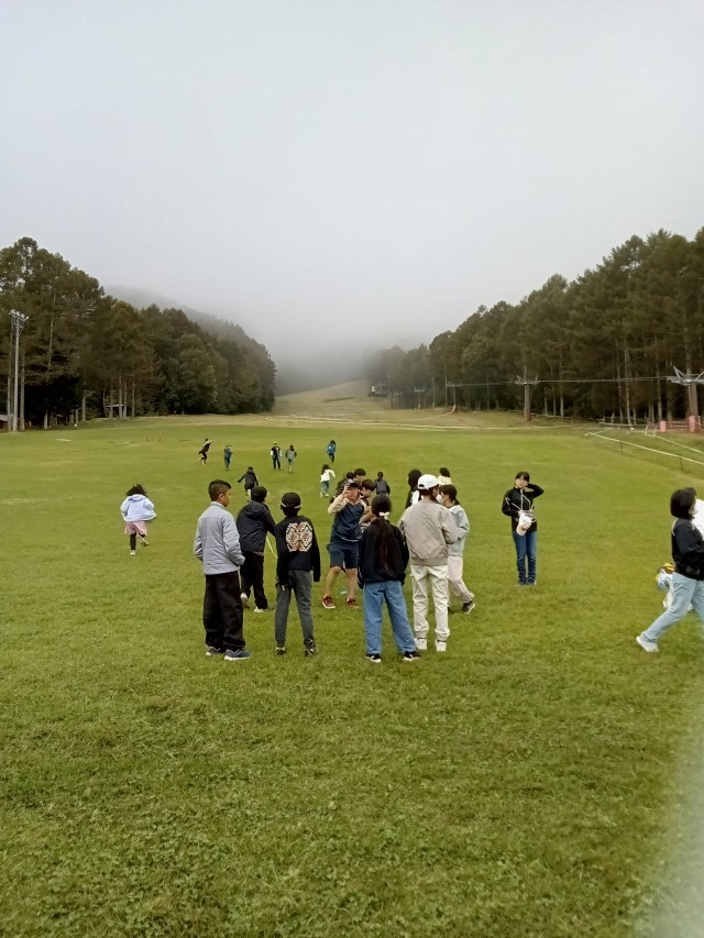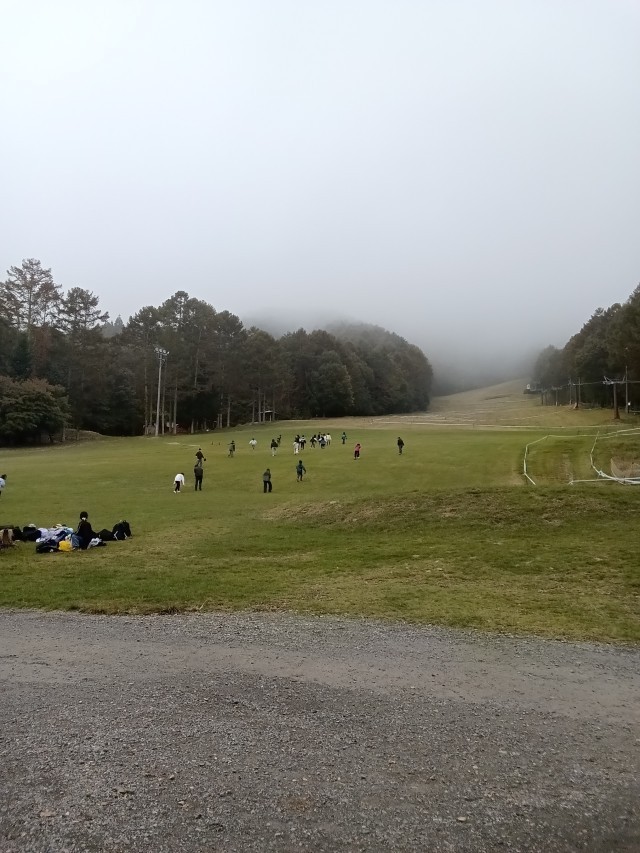 富士見パノラマスキーリゾートに到着しました。まだ雨は降っていませんが、11時以降の雨予報は変わりません。今のうちに、スキー場のステキな「緑じゅうたん」の斜面でレク遊びです。