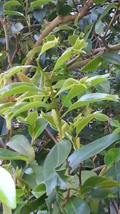 地域の方から送られてきました。高さ3メートルほどで、三っ尾の金魚のような葉っぱをつけた「金魚葉椿」です。「落ちてる葉っぱなら持ち帰っていい」との公園事務所の話に、数枚いただきました。