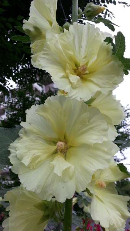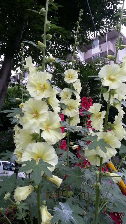 子供のころから、「タチアオイのてっぺんの蕾が咲いたら梅雨明け」と、教えられてきました。最近は、黄色やピンクのタチアオイも見られます。