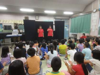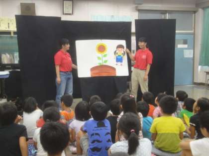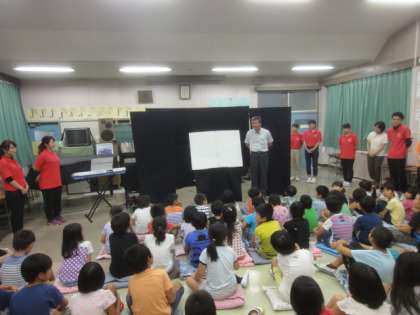 創価大学の学生ボランティアの皆さんによる人形劇教室がありました。1,2年生となのはな学級の子供たちが観賞しました。パネルシアター「がんばれハナちゃん」、手遊びゲームの様子です。