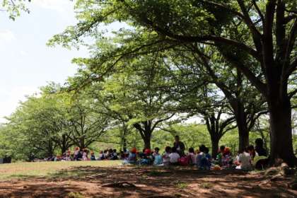 木陰でおいしいお弁当を食べました。作ってくれた方に感謝して「いただきます」。