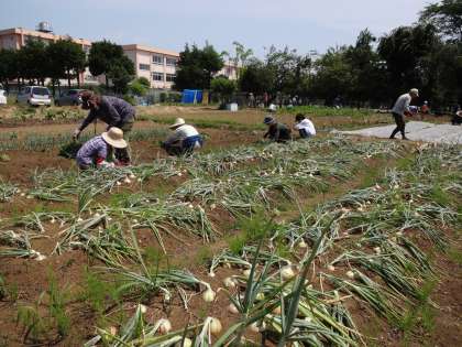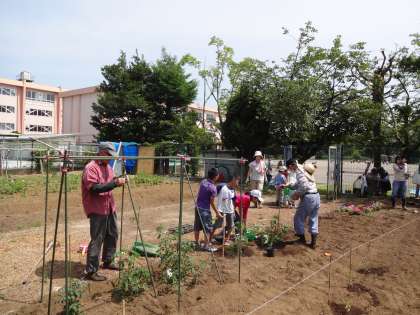 今週は子供たちもたくさん参加してくれました。トマトの苗植え、水運び、雑草取りと大活躍です。スイカも花を咲かせています。夏祭りが楽しみです。