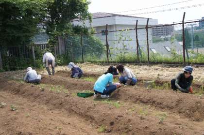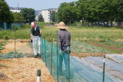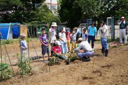 スギナ取り、スイカの周囲のネット張り、ミニトマト苗植えをしました。