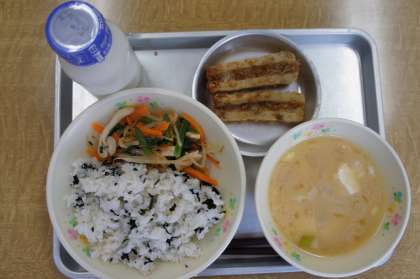 梅若ごはん、みそ汁、ちくわのマヨネーズ焼き、彩り和え等です。