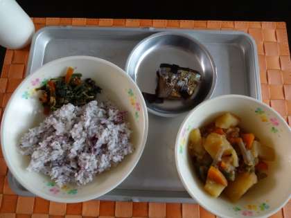 ゆかりごはん、さんまのつつ煮、肉じゃが、ほうれん草ともやしの煮ひたし、牛乳です。